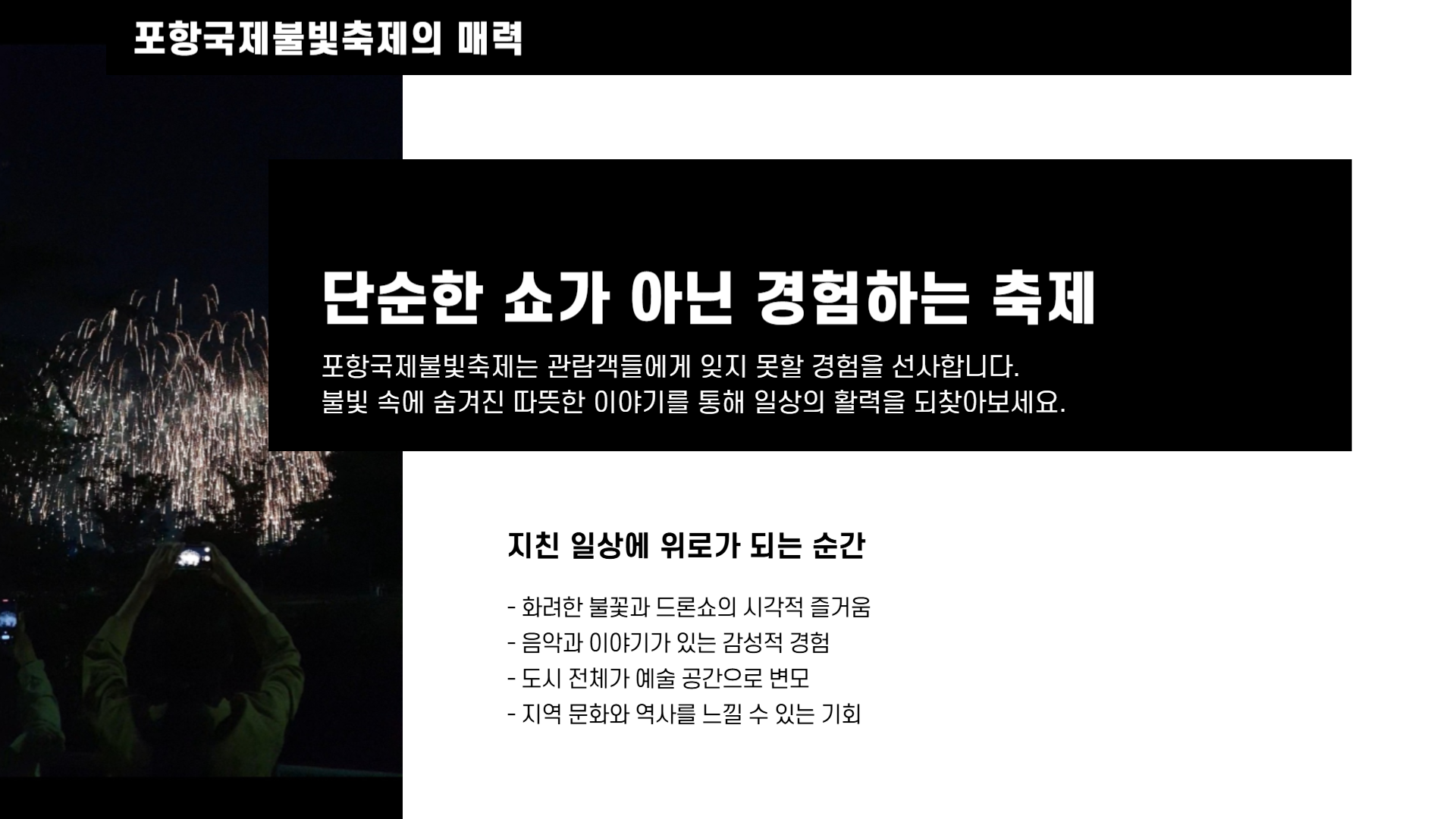 한여름 밤, 지친 일상에 불빛처럼 다가올 감동. 포항국제불빛축제에서 당신만의 여운을 찾아보세요. 불꽃과 드론이 수놓는 하늘, 지금 당신을 기다립니다.